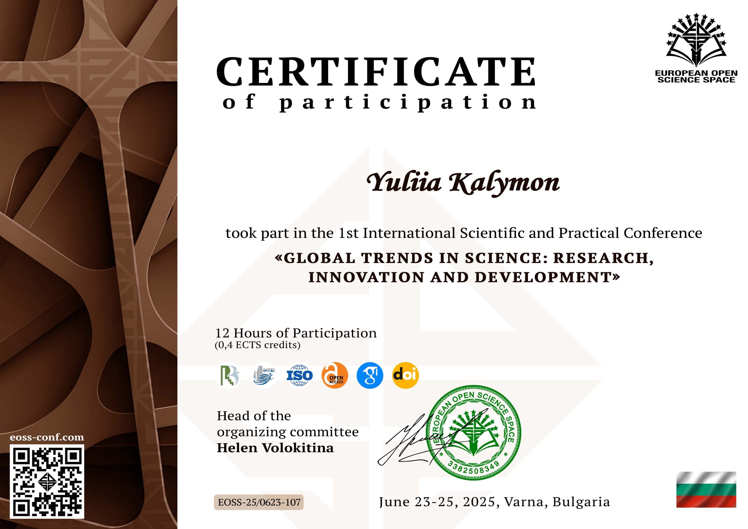 Кожен учасник міжнародної конференцій отримає безкоштовно електронний сертифікат учасника з вказівкою 0.8 кредитів ECTS за результатами самоосвіти та за вимогою – довідку про прийняття матеріалів. Сертифікати будуть доступні для завантаження у вкладці Архів.